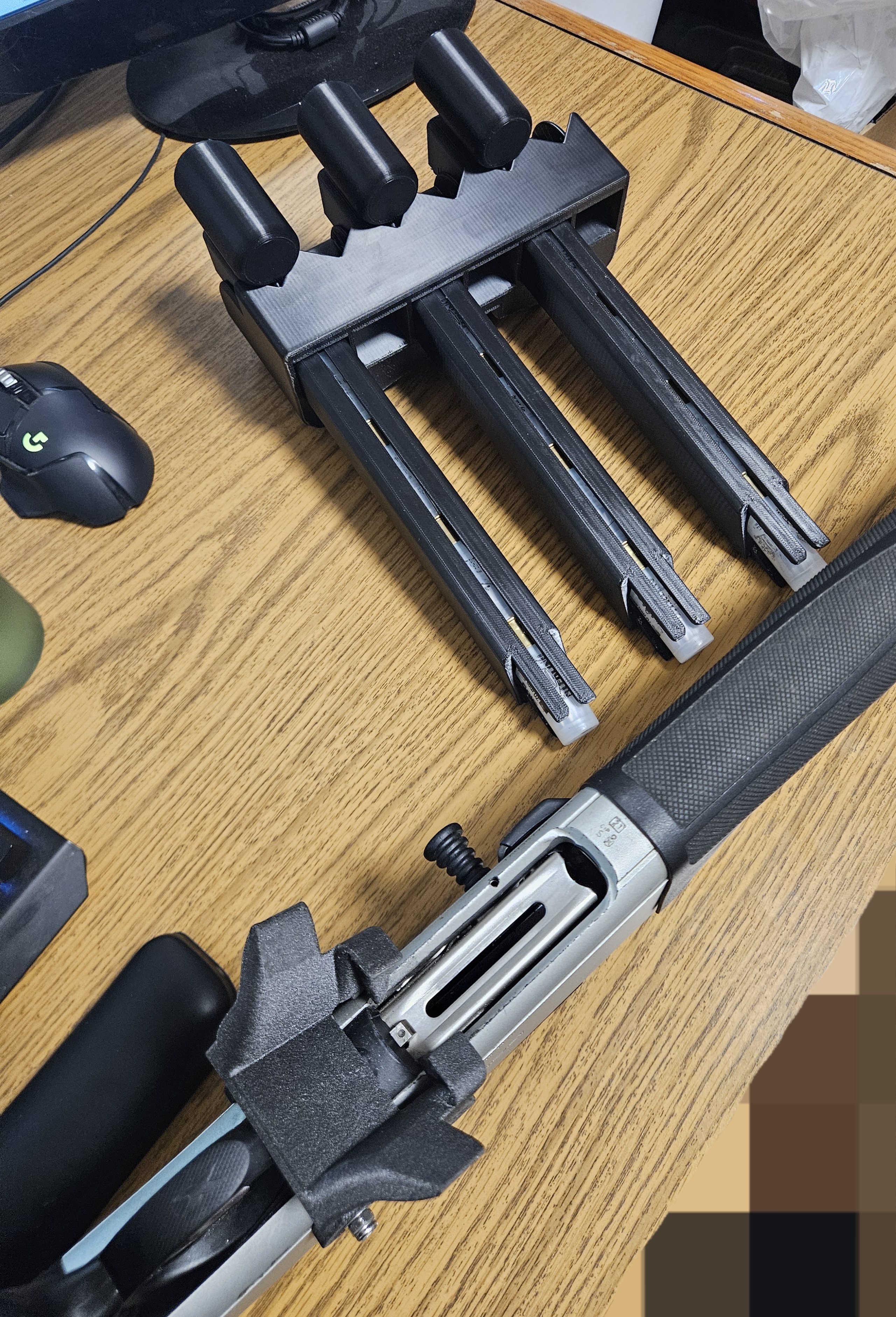 So here I am 6 months later having put a lot of work into developing completely 3d printed parts for straightforward manufacturing and consistency...something both functional and durable that I would actually feel a lot less imposter syndrome about asking someone money for. I have switched to much better materials, ABS and PPA-CF. I am proud of just having gone to the trouble of making something. It's even a useful something if you want to cut down reload times. The standard 1301 is not an easy shotgun to try to quad or even double load, and neither are most other standard, sporting, or tactical variants of shotguns that are mostly designed around home defense, hunting, sporting, or duty use.