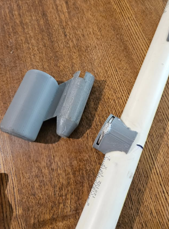 So what to do? I had bought an Ender 3 3d printer and had been learning a lot while using it. I decided to try to make some home made copies of what I saw Jerry use. I went to home depot and found PVC pipe with a 1 inch inner diameter, a little hardware, and some glue. With these and some printed tabs, I managed to make the tubes. The plungers and ramp were entirely 3d printed. This was all in PLA mind you which is not a very durable plastic. I committed to doing it a couple weeks before the match started, and the majority of it was done the night before the match. I got about 40 minutes of sleep that night around 5:30 am. It worked but holy shit was it janky.